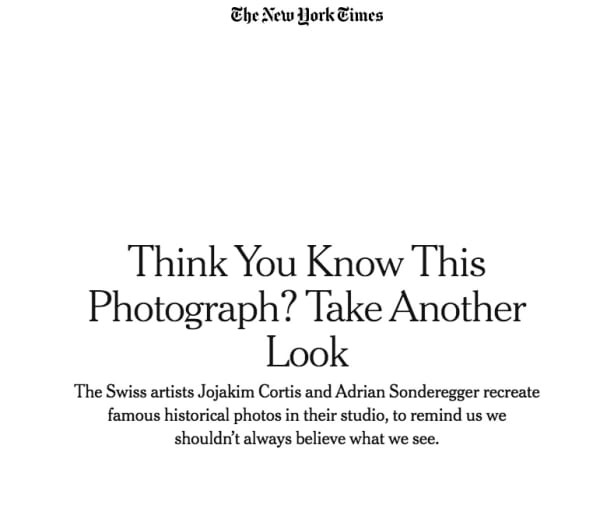 Since 2012, artist duo Jojakim Cortis (b. 1978, Germany) and Adrian Sonderegger (b. 1980, Switzerland), otherwise known by their shared name Cortis & Sonderegger, have been constructing exhaustive dioramas (a three-dimensional theatrical model) by hand of iconic photographs that balance between truth and fabrication.