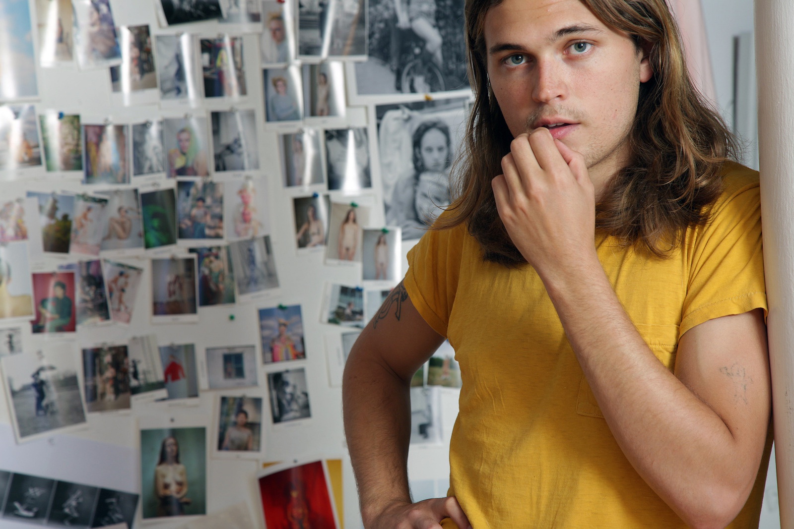 Mike works primarily for himself and his community, finding inspiration in his core group of friends and expressing something that, at its core, feels very personal (and real heartfelt). Earlier this year, Mike, who is also one-half of Mike and Claire with Claire Christerson, completed Calligraphy by Men, a series featuring hieroglyphic-repetitive bodies–some on burlap and cotton–and participated in BOOKLUB 10, an edition of the ongoing BOOKLUB performance series (this time curated for MOMA by India Salvor Menuez). Below is our recent e-mail correspondence with him–in which he discusses what’s piquing his interest at the moment–following his studio visit with photographer Olimpia Dior.
