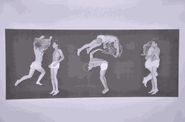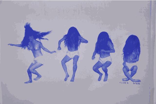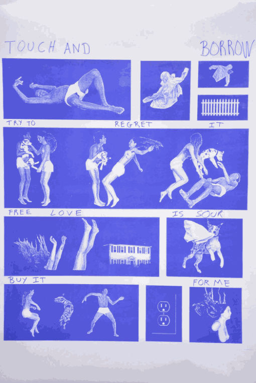 "I was making work with Alexandra Marzella for a while -- these black and white photocopy scans," Michael told us of his collaborative commission. "I shot close friends wearing the collection and had people fall off ladders or jump on trampolines in my apartment. The images are meant to be read from left to right, like a comic book or text. I was really into body language and saying something without using words."