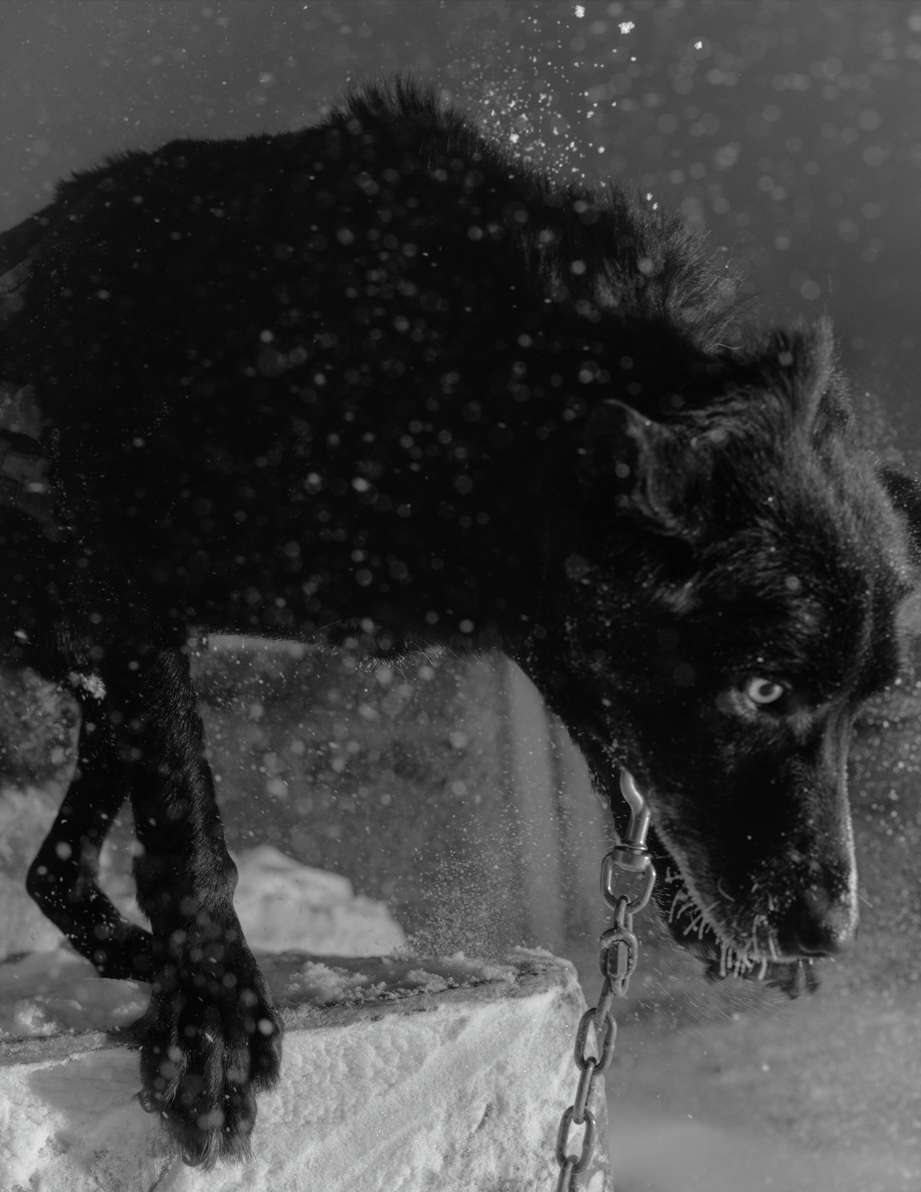 On the following page, the first sign of life is presented: the black silhouette of a dog against a chain-link fence, its features barely visible. “The cold was draining the battery so quickly that the strobe misfired on this picture,” says Mahaney. “But I happen to like the misfire more than if this dog had been perfectly lit.”