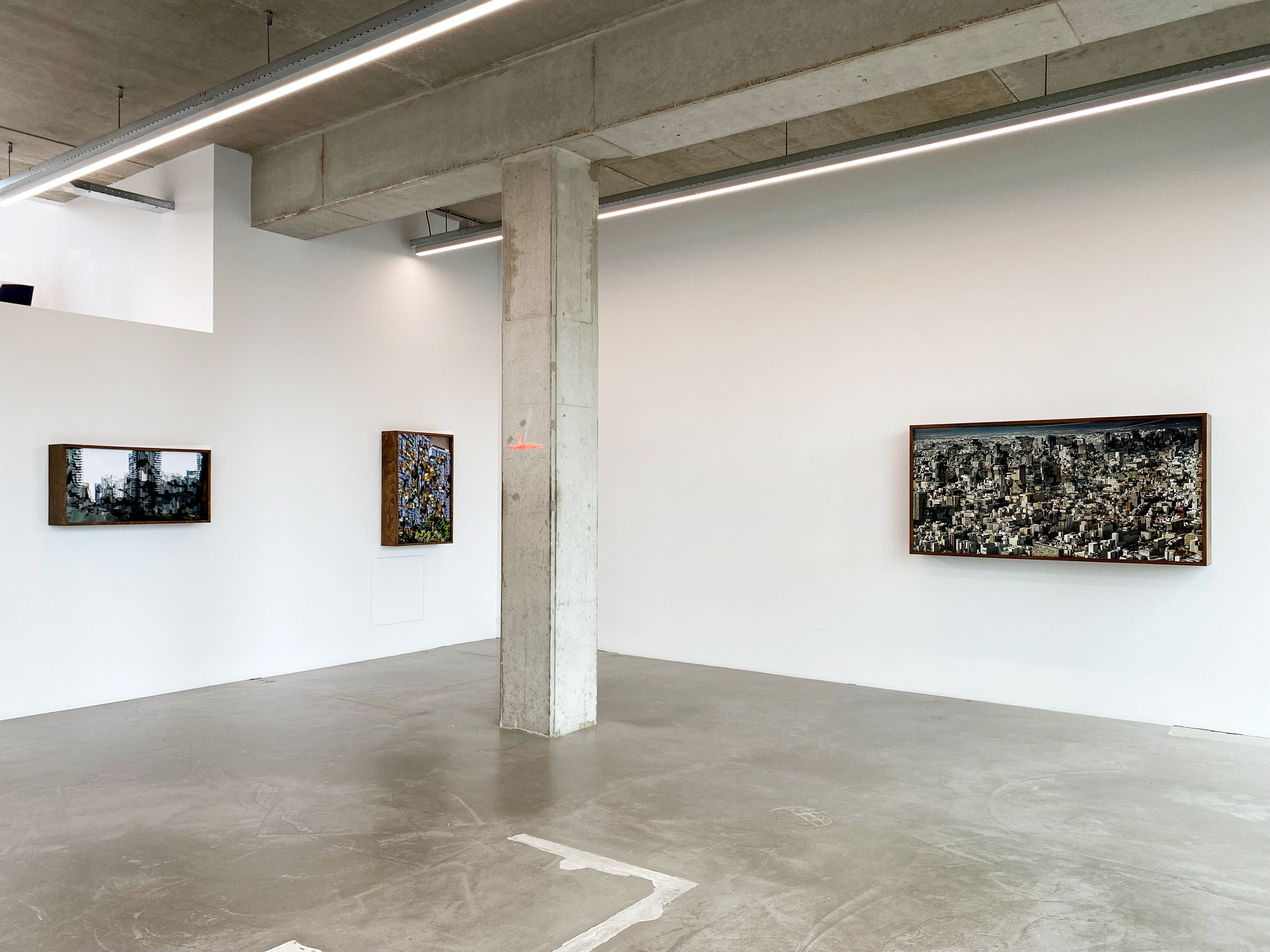 De Duitse Kunstenaar Michel Lamoller (1984) is wars van deze klimaatmoeheid en visualiseert in The Ravenstijn Gallery overtuigend de overdadige aanwezigheid van onze collectieve massa aan materie. De solotentoonstelling Anthropogenic Mass toont een tiental minutieus uitgevoerde fotocollages en één installatie die hetzelfde principe volgt in het groot. Door foto’s van miljoenen steden in Azië in stukjes op te knippen en in eindeloze laagjes over elkaar te leggen, ontstaan er kijkdozen van architecturale elementen. Balkons van rijen flatgebouwen buitelen over en door elkaar heen terwijl daken opengeknipt zijn om erin nog vier keer hetzelfde dak te kunnen tonen. Door de vele herhalingen ontstaat een caleidoscopisch effect van stedelijke vormen.