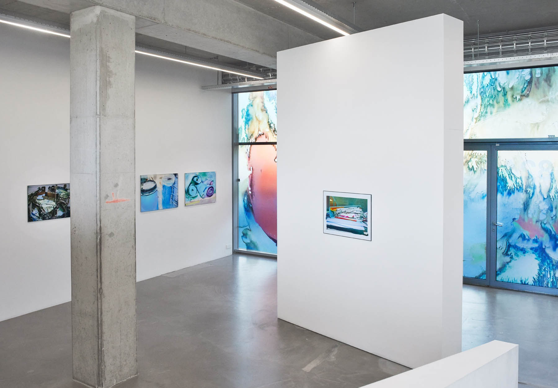 Schooled in the slick aesthetics of applied photography, Simonet’s practice has in recent years stepped away from fashionable worlds of control and perfection, embracing a painterly sense of irreproducibility, and celebrating the material potential of image-making. Suitably, The Keys to the Factory reflects the restlessness of the site it examines, establishing a space of steady transformation rather than just a stable collection of finished words. In an exhibition that evokes the messy dynamism of a studio–cum–production site, Simonet’s Mechanical Paintings are anything but fixed. Printed onto plastic coils commonly found in offset printing, then altered further through coating, sweeping, drying and washing, these images transform over the course of time, their liquid colours bleeding across defiant, unabsorbent surfaces.