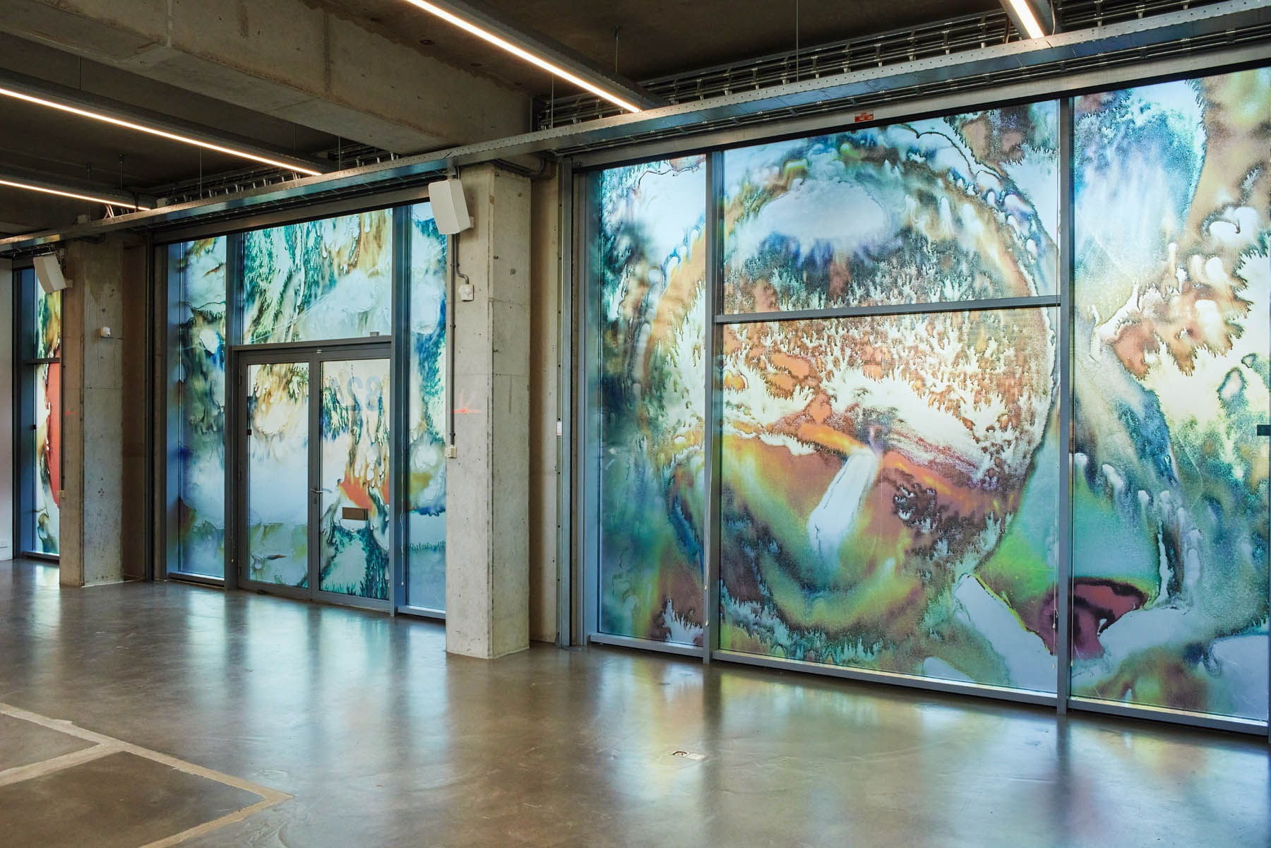 Elsewhere, the exhibition displays a number of Simonet’s innovative Waterworks publications side by side, of which only a handful remain. Developed at the factory in 2021 through a bespoke printing process, Waterworks marked the start of Simonet’s study of the site. Just 30 copies of the book were produced; uniquely hand-assembled, their image sequences are consistent, but the manifestations of their printed images vary widely from copy to copy. An imposing textural window installation – rendered ‘like an aquarium in ink’ – completes the exhibition.