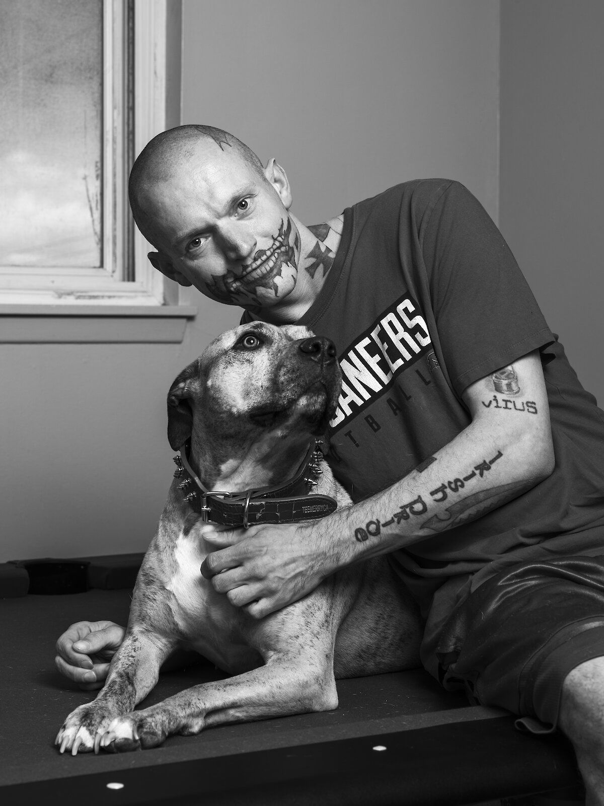 "Why do you have that tattoo, anyway?" I point to the bloody open-skull tattoo around his mouth. He resolutely replies, "One: I love zombies. Two: it's unique." While he struggles to articulate the words, his body continually and involuntarily twitches.