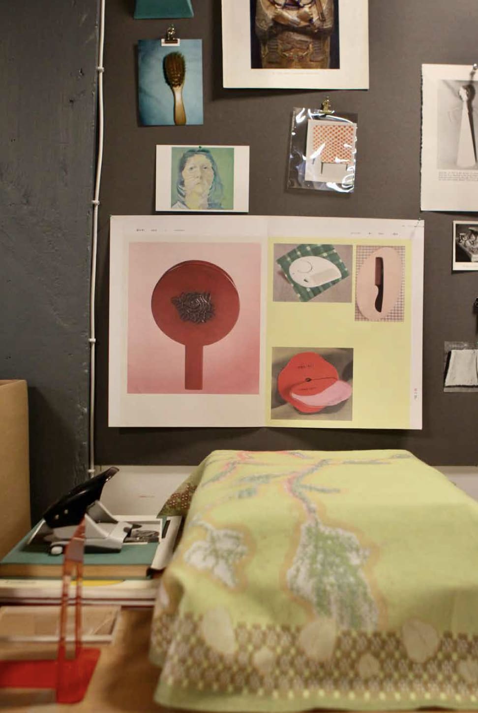Hier archiveert, vouwt, knipt en plakt ze afbeeldingen van borden, taarten, handen en instructiefoto’s uit oude huishoudboekjes tot levendige collages, vaak aangevuld met geschilderde kleurvlakken. “Ik had ooit elders een atelier, maar ik werk het liefst thuis en alleen”, vertelt ze. “Het voordeel is dat het atelier hier altijd is. En ik kan altijd even pauzeren om de afwas te doen.”