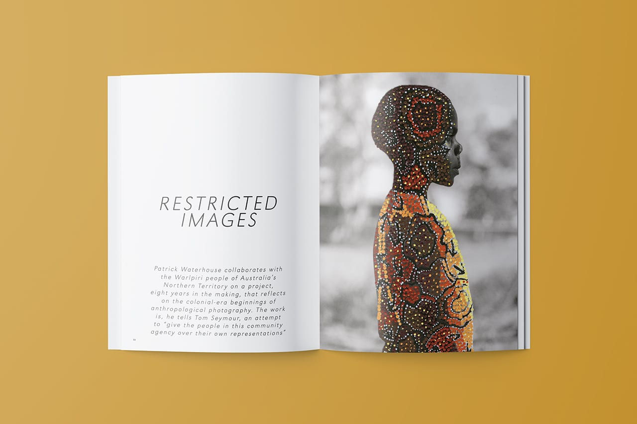 The cover feature for this month’s issue is the work of Patrick Waterhouse. Over the course of eight years, he has travelled to and from Australia’s Northern territory, culminating in his latest project: Restricted Images. Made in collaboration with the Warlpiri people, he hopes to give agency to his subjects by asking them to contribute creatively to each image. Through his artistic process, he addresses the problematic break in representation, respect and consent between the first anthropological photographs of the indigenous groups of the past.